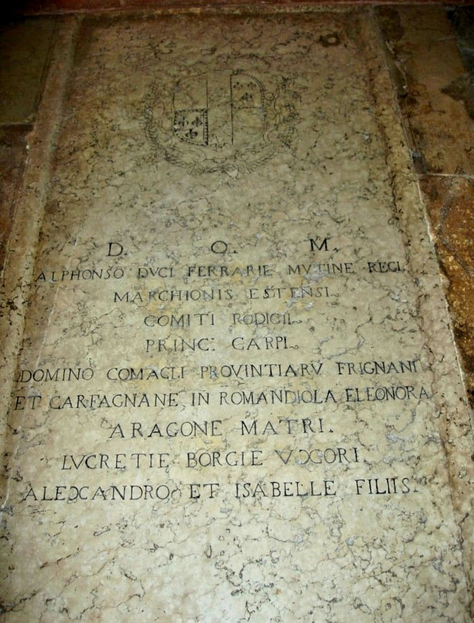 Un luogo piccolissimo, raccolto, pieno di “presenze storiche” reali, dove si respira un’atmosfera davvero particolare: parliamo del Monastero di clausura della clarisse, il Corpus Domini, in via Pergolato, dove si trovano le tombe degli Estensi. In primis Lucrezia Borgia, moglie di Alfonso I. In fondo al coro, sotto una lapide discreta, sono raccolti resti di altri Estensi provenienti dalla scomparsa della chiesa di Santa Maria degli Angeli, una sorte di “seconda traslazione poco visibile ma storicamente significativa.